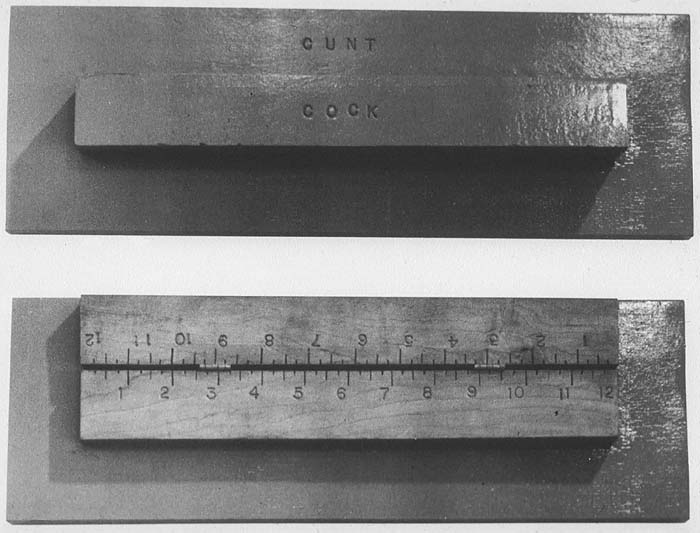 Robert Morris, Untitled (Cock/Cunt), Rulers hinged together, mounted on wood base, 14 x 42.2 x 3.8 cm, 1974 |