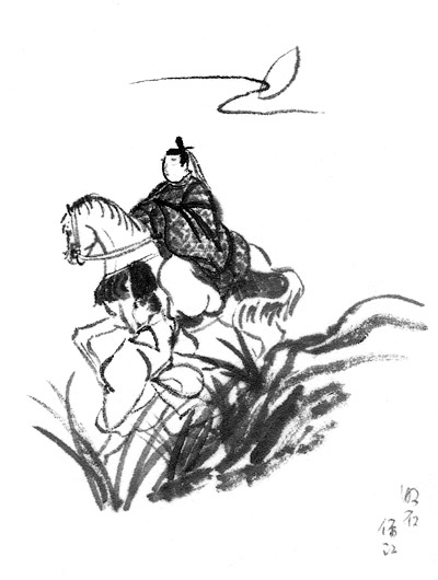A pictorial subject based on Chapter 13 of Genji monogatari 源氏物語 (The Tale of Genji). In the third month, a storm devastates Genji's residence at *Suma 須磨, and that night in a dream he receives an omen from his late father. As the dream predicts, Genji is visited the next day by a retired courtier who has taken vows with the priest of Akashi Akashi no nyūdō 明石の入道. Genji accepts an invitation to the priest's mansion and soon becomes involved with his daughter, known as the Akashi Lady, Akashi no Ue 明石の上. Meanwhile, factions change at court and Emperor Suzaku 朱雀 calls Genji back to the capital, by which time the Akashi Lady is pregnant. The child will become Empress Akashi, Akashi no Chūgū 明石中宮 who, along with the wealth that her mother brings into Genji's household, proves to be a most important factor in solidifying Genji's rising position at court. Frequent illustrations include: the priest playing a lute, biwa 琵琶, and Genji accompanying on the Japanese harp, koto 琴, as they gaze upon the island of Awaji 淡路; and Genji going to visit the Akashi Lady, riding on horseback along the moonlit coast in the eighth month.