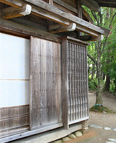 1 Wooden shutters constructed at the various openings of a building. They slide out from a special storage box attached to the wall of the building. When not needed, they are slid back into the storage box. The shutter positioned at the farthest point away from the storage box is moved out first along a single track; each shutter follows the previous one and is pushed until it meets one already in place. Many shutters have mortises *hozo-ana ほぞ穴, on the edge of one side and tenons *hozo ほぞ, on the adjoining side for assuring a close fit. They also may have a tongue and groove, sanehagi 実矧, for the same purpose. When all are in place, they are secured by special wooden bolts otoshizaru 落し猿 (see *saru 猿), that drop into the sills and/or by vertical wooden bolts agezaru 上げ猿 that are pushed up into holes in the lintel *kamoi 鴨居. A sliding horizontal wooden catch holds the agezaru in place. Amado are used at night to enclose the building and ensure its security from thieves. They also protect the interior from wind, rain, or snow. Amado vary in style and size. Some have small sliding panels that can be opened for ventilation in old traditional houses. It is said that amado first appeared around the latter part of the 16th century. They are found on temple buildings, jiin 寺院, some shrine buildings *jinja 神社, vernacular dwellings *minka 民家, and mansions, yashiki 邸.