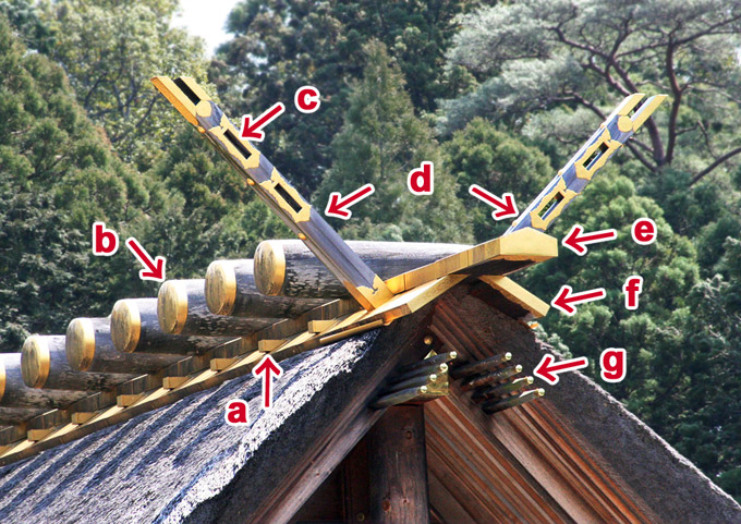 4 On shrine buildings in *shinmei-zukuri 神明造, the aori-ita are boards that act as drip caps. They are attached to each side of the ridge from one end to the other and are held by penetrating beams called *hinuki 飛貫. They are under the ridge cover *kō-ita 甲板, and below the support for the billets *katsuogi 堅魚木. They slope to the same degree as the roof incline *kōbai 勾配, and protect the ridge by deflecting rain.