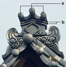 Also pronounced shimesuji 〆筋. The parallel chevron lines on the front or sides of a lion-mouth roof tile *shishiguchi 獅子口, which was used to decorate a roof ridge on Edo period shrines, temples, and palaces.