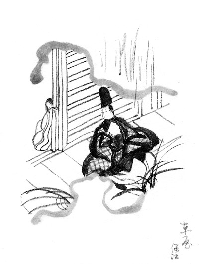 Lit. Eastern cottage. A pictorial subject based on "The Eastern Cottage" Azumaya, Chapter 50 of Genji monogatari 源氏物語 (The Tale of Genji). Main characters in the chapter are: Kaoru 薫 (who is Genji's purported son, but in truth was fathered by Kashiwagi 柏木), Prince Niou *Niou no Miya 匂宮, *Ukifune 浮舟, her mother from Hitachi 常陸 (modern Ibaraki Prefecture), and Ukifune's half-sister Naka no kimi 中君, who is the wife of Niou. In the chapter, Ukifune and her mother go to the house of Naka no kimi. Ukifune attracts Niou's attention, and he attempts to seduce her. Her mother takes her away, first to a small villa (poetically referred to as an Eastern cottage) at Sanjō 三条, then back to Uji 宇治, where Kaoru finds her and takes her to his own villa. Scenes often chosen for illustration include: 1) On an autumn morning, Ukifune's mother watches Niou playing with his young son before leaving for court; 2) Ukifune and Naka no kimi look at illustrated romances, e-monogatari 絵物語, while Ukon 右近, a lady-in-waiting, reads the accompanying text out loud; and 3) Kaoru visits Ukifune at the small villa in Sanjō, where he hears peddlers at dawn walking about with their wares balanced on the tops of their heads. While waiting there, Kaoru refers to an Eastern cottage azumaya in a poem. Scenes two and three are found in illustrations to the 12th century masterpiece owned by the Tokugawa 徳川 Art Museum.