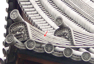 Roof tiles used to make the offspring ridge *chigomune 稚児棟, a short ridge closest to the outer end of a corner ridge *sumimune 隅棟. The tiles are usually flat, similar to those piled up on the main ridge. The number of flat tiles depends on the length of the offspring ridge and the desired amount of curve. Chigomunekawara are occasionally composed of very decorative tiles above a flat tile base, which are then covered with one or two more layers of flat tiles. In all cases, the offspring ridge is finished with coping tiles *fusumagawara 伏間瓦, with a slightly flared appearance. An ogre tile *onigawara 鬼瓦, called *ichi-no-oni 一の鬼 (first ogre tile) is placed at the outer end of the corner ridge. This is smaller than the second ogre tile, ni-no-oni 二の鬼, which is placed at the end of the main descending corner ridge.