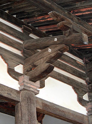 Lit. a strengthening bracket arm. An extension of an interior tie beam which terminates on the exterior as a bracket arm *hijiki 肘木 to receive and support the tail rafter *odaruki 尾垂木. This bracket arm lessens the downward thrust of the tail rafter and stabilizes the overall weight of the structural members of the roof.