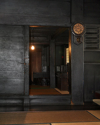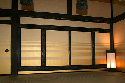 2 Also called nandogamae 納戸構え. In traditional vernacular houses *minka 民家 from at least the 14th century, the entrance to the back chamber *chōdai 帳台 or *nando 納戸. As in 1 above, the threshold was usually raised but the lintel was not lowered, to judge from surviving examples. A single wooden sliding door katabiki itado 片引板戸 with a flanking panel of timber *sodekabe 袖壁, or a pair of paneled sliding doors, itado 板戸, flanked by half bay panels were the most common types. The flanking panels were often designed to create a strong accent, like the example at Imanishi 今西 House (1650), Imaichō 今井町 in Nara, with its armor-style timber siding, yoroi shitami itabari 鎧下見板張り. The paneled doors had a drop bolt, otoshisaru 落し猿, to lock the door. Sometimes an extra runner was provided for sliding screens behind the paneled doors. The chōdaigamae first lost its high threshold and then gradually fell into disuse during the Edo period as the back chamber became less enclosed, though in certain areas, such as the Island of Sado 佐渡, it persisted until the 19th century. It has been argued that the high threshold was originally provided to prevent straw bedding material wara 藁 from spreading through the house.