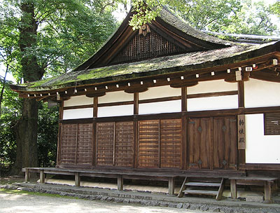 Example: the two side by side room sat Kamo Mioya Jinja 賀茂御祖神社 (1863) in Kyoto, each of which are three bays wide and two bays deep with gabled roofs *kirizuma-zukuri 切妻造, covered with cypress bark *hiwadabuki 桧皮葺. These characteristics do not reflect a set arrangement for such buildings. On the contrary, there is considerable variation in size and treatment of shrine buildings.