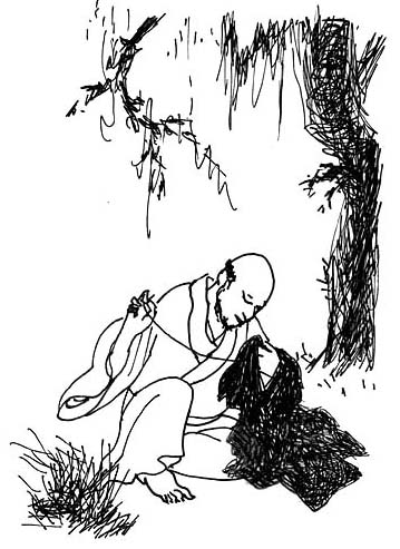 The oldest extant painting on the theme is by Wu Zhuzi 無住子 (1295; Tokugawa 徳川 Art Museum, Aichi Prefecture), although there are also versions attributed to Muqi (Jp: Mokkei 牧谿; late 13th century; Dōmoto 堂本 Collection, Kyoto) and Yintuoluo (Jp: Indara 因陀羅; private collection). Two Japanese examples are particularly well-known, one by Chūan Shinkō 仲安真康 (mid-15th century; Tokyo National Museum) and the other a pair of hanging scrolls attributed to Kaō 可翁 (early 14th century; Boston Museum of Fine Arts and Cleveland Museum, USA).