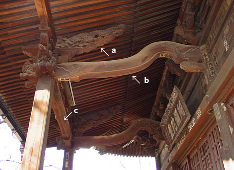 An usually-shaped rainbow tie beam thought to resemble the back of a lobster or shrimp or an s-shape turned on its side. It is used in the aisles *hisashi 廂 surrounding the core *moya 母屋 of a temple or shrine building when the pillars of the core and the hisashi vary in height. Ebikōryō are used on each side of a step-canopy *kōhai 向拝 to join the pillars at the bottom of the steps to the head-penetrating tie beams *kashiranuki 頭貫 that are inserted into the tops of the pillars that form the outer framework of the building. Ebikōryō were one of the characteristic structural members of the Zen style *zenshūyō 禅宗様, introduced in the early 13th century. Although found mainly in Zen style temple buildings, it was also imitated in wayō style *wayō 和様 buildings. Originally the curvature of the ebikōryō was slight but gradually it became exaggerated. An early example is found at Kōzanji Butsuden 功山寺仏殿 (1320), Yamaguchi Prefecture; and a late example at Unpōji Hondō 雲峰寺本堂 (late Muromachi period), Yamaguchi Prefecture.