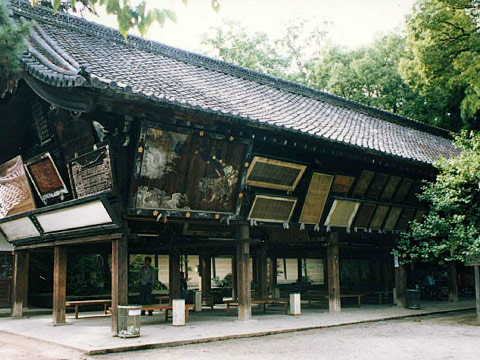Extant examples date only from the proto-modern period: Yasaka Jinja 八坂神社 Emaden, Kitano Tenmangū 北野天満宮 Emadokoro (1608), both in Kyoto; Kotohiragū 金刀比羅宮 Emadō (1748), in Kagawa Prefecture.