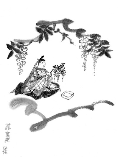 A pictorial subject taken from the "Wisteria Leaves" (Fuji no uraba, underleaves of wisteria), Chapter 33 of Genji monogatari 源氏物語 (The Tale of Genji). In this chapter Tō no Chūjō 頭中将 has resigned himself to the love between *Yūgiri 夕霧 (Genji's son), and his daughter, Kumoi no kari 雲井雁. The open rivalry with his old friend Genji has abated. Tō no Chūjō invites Yūgiri to a banquet under the wisteria blooming in his mansion garden to signal his acceptance, at long last, of Yūgiri's marriage proposal. The banquet scene under beautiful wisteria hanging from a tall pine in the garden is most often illustrated. Other illustrations include Emperor Reizei 冷泉 and retired Emperor Suzaku 朱雀 visiting Genji at Rokujō 六条 while servants are on the lake fishing.
