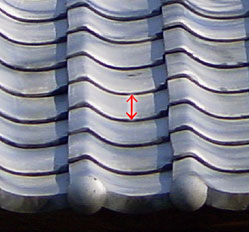 The length of the visible surface of an ordinary broad, concave roofing tile, *hiragawara 平瓦, that was laid in an overlapping pattern starting at the edge of the eaves. Although there was no fixed size, on average, these tiles were about 30 cm wide at their wider end and approximately 40 cm long. Furthermore, there was no prescribed size for the visible surface of the tile, but usually about 15 cm for each group of three tiles was discernible, leaving about two thirds of each tile covered. Fukiashi also applies to roofing with shingles, *kokerabuki 柿葺, and cypress bark shingles, *hiwadabuki 桧皮葺.
