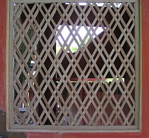 Lit. grouped or varying numbered lattice. Lattice or small beams arranged to form patterns in transoms, *ranma 欄間, on latticed doors or windows in gable pediments, and even to form coffers in a ceiling, *gōtenjō 格天井. The lattice may be set either horizontally, vertically, or in a crisscross pattern. Fukiyose gōshi are not always evenly spaced. There are variations in the ratios between individual lattices as well as between groups to form decorative patterns. Many varieties of patterns are also found in the framework of *shōji 障子.