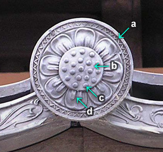 Also written 複弁蓮花文. A double-lotus-petal motif applied to the pendant tiles, *gatō 瓦当, along the edge of the eaves of a tiled roof. The double-petal motif is believed to have first appeared in the Hakuhō period. Usually eight petals are arranged around a center circular pod containing a varying number of raised seeds, *chūbō 中房. Each double-petal is divided by a line emanating from the outer rim of the pod. Each half of the petal contains a seedling leaf. Although a real lotus flower has sixteen petals, to arrange that number of petals on a pendant tile would look more like a chrysanthemum motif which did not appear until the 16th century. Therefore, reducing the lotus motif to eight double-petals produced an excellent stylized lotus pattern. This pattern remained popular for temples and palaces constructed through the late 12th century. Examples of the pattern have been excavated at many sites including the Sūfukuji 崇福寺 site, Shiga Prefecture; the Fujiwara 藤原 Palace site and the site of the Yamadadera 山田寺, both in Nara; the Heijō 平城 Palace site, also in Nara; and the Heian 平安 Palace site, in Kyoto.