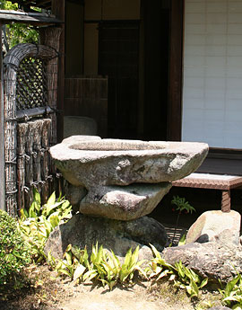 Lit. boat shape. A type of functional or decorative water basin, *chōzubachi 手水鉢, which utilizes a natural stone shaped like a boat. The major difference between fune-ishi 舟石 in dry gardens and funagata chōzubachi is the shallow water pool carved into the top of the water basin.