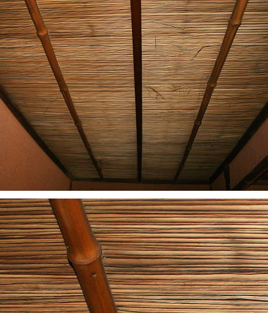 Also called gamatenjō 蒲天井. A wood-board ceiling to which reed-mace, braided straw or rush mats are attached. The matting is set in wooden frames laid parallel and held together at wide intervals by cord. It is mainly used on a dropped ceiling *ochitenjō 落天井, above the host's mat *temae datami 点前畳, in small tea ceremony rooms with a rustic appearance *sōan 草庵. Example: Fushin'an 不審庵 Omotesenke 表千家, Kyoto.