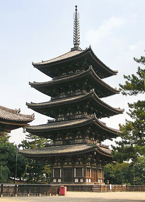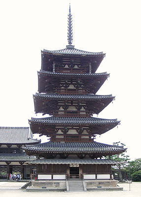 A five-storied pagoda usually 3 x 3 bays square with the central bays used as entrances. The corner bays most often contain a plastered wall with vertically mullioned windows *renjimado 連子窓. Pagodas of this type were constructed on a stone podium in the ancient period and on a wooden floor supported by posts placed on base stones in later periods. However, relatively few five-storied pagodas were built after the Heian period. The stories above the first contain only structural members. The central pillar *shinbashira 心柱, at Hōryūji 法隆寺 in Nara, the oldest extant, built in the late 7th to early 8th century, was set over two meters below ground level. Later five-storied pagodas were set at ground level. The first story contains a one-bay square inner sanctuary *naijin 内陣 marked by four so-called guardian pillars *shiten-bashira 四天柱, a Buddhist altar with statues, and paintings that decorate the walls and structural members. In the Momoyama and Edo periods, a floor was laid on each story and the structural members were decorated. The central pillar was hung above the ceiling. Examples: Gojū-no-tō, Hōryūji and Daigoji 醍醐寺 (952) in Kyoto, which was constructed up from ground level. Kaijūsenji 海住山寺 (1214) in Kyoto. Rurikōji 瑠璃光寺 (1443) in Yamaguchi Prefecture. Proto-modern: Kyōōgokokuji 教王護国寺 (Tōji 東寺; 1644) in Kyoto; and Kan'eiji 寛永寺 (1631) in Tokyo.
