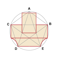 Lit. a five cornered measuring box. A method used to determine the proportions of a bracket arm *hijiki 肘木, and bearing block *to 斗. First, lines are drawn from the top center A of the bracket arm to its lowest corners. These lines are continued to the corners B and C of the bearing block. Next lines CD and BE are drawn. The five apexes, AE, EC, CB, BD, and DA are equidistant from each other. A circle is inscribed by connecting these points.