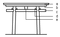 A pillar of the shinmei type, *shinmei torii 神明鳥居, with no curves on the horizontal members. Similar to the *kasuga torii 春日鳥居 but with one difference: the ends of the straight top lintel, *kasagi 笠木, and secondary lintel, *shimaki 島木, are cut with a downward slant. The former projects an imaginary line directly to the center of the bottom of the pillar. The latter projects an imaginary line to the outer edge where the pillar and ground line meet. The circular pillars taper slightly toward the top and have an inward incline. *uchikorobi 内転. The tie beam, *nuki 貫, is square in section, and there is a centered strut, gakuzuka 額束, between tie beam and secondary lintel. Example: Iwashimizu Hachimangū 石清水八幡宮 in Kyoto. The torii at this shrine is unusual as it has no wedges, *kusabi 楔, inserted to strengthen the joint where the tie beam penetrates the pillars.