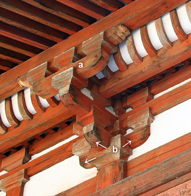 A single bracket arm *hijiki 肘木, which is set into a large bearing block *masu 斗. Two or three smaller bearing blocks *makito 巻斗 are set into the top surface of the masu. It runs parallel to the wall plane and supports the eave purlin *gagyō 丸桁. It may carry a *sanehijiki 実肘木, a bracket arm on which the eave purlin rests directly. The name is said to be derived from its resemblance to a balance because of the small bearing blocks on each end.