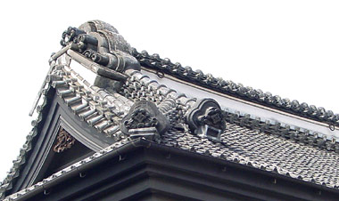 1 The classic type, believed to have developed in the early modern period, was used in temples and shrines as a lightweight alternative to the heavy traditional ridge built up entirely from layers of tile. Typically, a row of struts hakomuneuke 箱棟受 were set upon the ridge purlin munageta 棟桁 (see *ōmune 大棟) of the main roof to support the ridge member, called ukemune 請棟. A frame was erected around the struts to support the vertical siding, hara-ita 腹板, the base of which rested upon boards *aori-ita 障泥板 laid along the main roof. The roof of the hakomune was formed by a pair of sloping boards, the amenoshi 雨熨斗, spanning from the ukemune to the hara-ita, and the joint between them was protected by a cover piece called the ganburi 雁振. The hakomune was either cased in copper (especially when the remainder of the roof was made of copper as in many of the structures at Nikkō Tōshōgū 日光東照宮, Tochigi Prefecture) or roofed with tile, the hara-ita being finished with plaster *shikkui 漆喰, in the latter case. At either end of the roof, the hakomune was flanked by large plastered roof ornaments *kagemori 影盛.