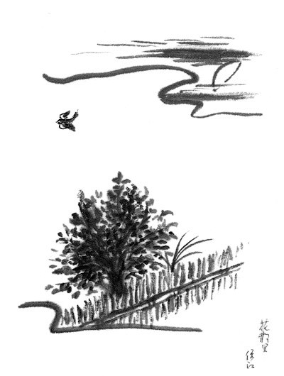 A pictorial subject based on Chapter 11 of Genji monogatari 源氏物語 (The Tale of Genji), "The Orange Blossoms" Hanachirusato (the village of scattering blossoms). Hanachirusato is the name of the village and the name given to Genji's love who lives there, the younger sister of Lady Reikeiden, Reikeiden no Nyōgo 麗景殿女御, a minor consort of the late *Kiritsubo 桐壷, Genji's father. Genji visits the village one clear night during the rainy season of the Fifth Month, samidare 五月雨. Illustrations of this very short chapter usually show Genji talking with the two sisters. In the garden are orange blossoms (tachibana 橘 a common symbol for past lovers) illuminated by a three-quarter moon while a nightingale hototogisu 時鳥 sings.