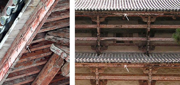 A fascia board. A board nailed flat against the rafter ends, characteristic of the daibutsu style *daibutsuyō 大仏様. When a fascia board is used, the eaves support kayari かやり, placed on the flying rafters is omitted.