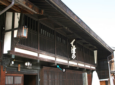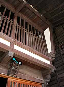 A jettied upper floor projecting beyond the plane of the line of posts defining the limit of the lower part of a town house *machiya 町家. Town houses with hanedashi nikai are depicted in early 17th century screens showing scenes in and around Kyoto *rakuchūr akugai zu 洛中洛外図 ; so it may be assumed that they existed in Kyoto at that time. Surviving examples, however, are concentrated in post towns *shukubamachi 宿場町, particularly in the Kiso 木曽 valley and other parts of Nagano Prefecture, and date from the late 18th century and 19th century. They were a feature of the town-house facade, and directly overlooked the street. Even in cases where the upper floor ran through to the rear of the building, there was no hanedashi nikai at the rear.The projection of the hanedashi nikai varied from around 45 cm to 60 cm. In early examples like the Sanayama 真山 House in Nagano Prefecture(1766) the hanedashi nikai was constructed simply by extending the sleeper *ōbiki 大引 and floor joist *neda 根太 supporting the loft floor beyond the girt *dōzashi 胴差 along the front of the lower floor. Later, brackets *udegi 腕木 were used, allowing the framing of the projection to be independent, with regard to joist spacing, from structural constraints imposed by the room behind. The projection of the hanedashi nikai was often slightly increased by the addition of a projecting lattice window degōshimado 出格子窓 along the front of the structure, but another and perhaps earlier arrangement was to leave it as an open balcony with a low handrail *tesuri 手摺.