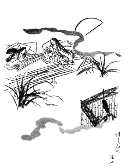 1 A pictorial subject based on "The Lady at the Bridge" Hashihime, Chapter 45 of Genji monogatari 源氏物語 (The Tale of Genji). The last ten chapters of the Tale are known as Uji Jūjō 宇治十帖 (The Ten Books of Uji). This chapter, the first of the ten, introduces the Eighth Prince Hachi no miya 八宮, a half-brother of Genji, and his two daughters, Ōigimi 大君 and Naka no kimi 中君, who live with him in his self-imposed retirement at Uji (south of Kyoto). The prince is known for his piety and wisdom. Kaoru 薫, whose serious character is engendered by deep misgivings about his paternity, begins to study under Hachi no miya. Eventually he learns from Ben no kimi 弁君, the daughter of *Kashiwagi's 柏木 wet nurse, that he is not in fact Genji's son, but rather the illegitimate son of Kashiwagi. The scene most frequently chosen for illustration shows Ōigimi playing a lute biwa 琵琶 and Naka no kimi a harp koto 琴 under the moon and clouds while Kaoru secretly peers in through a break in the villa's bamboo fence. This scene survives in a section of the earliest illustrated version (12th century) in the Tokugawa 徳川 Art Museum. See *genji-e 源氏絵.