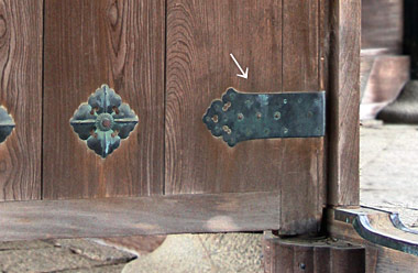 Also called hassō kanamono 八双金物; sakawa kanagu 逆輪金具 or saba-no-o 鯖の尾. Lit. twin eights metalwork. A long, narrow decorative metal work fitting *kazarikanagu 飾金具 that is bent around the hinged edge of a door leaf in such a way that the forked design appears on both sides of the door. Generally, the metalwork is gilt bronze and is nailed down top and bottom near the edges with about one third exposed on either side of the door. Aside from being decorative, it is practical. It strengthens the pivot hinge *jikuzuri 軸釣 and prevents separation from the door leaf. The name is derived from the identical forked design on each side of the door leaf (as sō 双 means 'both'), and the forked part resembling the character 八 hachi, meaning eight. Many hassō kanagu are decorated with embossed patterns on a thin metal sheet. From the Momoyama period and into the Edo period, some were made with brilliant relief patterns on thick metal plates. An example can be found on the plank doors *itakarado 板唐戸 of the Guest Hall, Kyakuden 客殿 at Daikakuji 大覚寺 in Kyoto. In this case, the ends are not forked but protrude. Patterns with protruding ends in the shape of a flower are called dehassō 出八双. These are the standard types of decorative metal-work on doors. Prior to the Heian period dehassō were used exclusively and continued to be used even after the introduction of the popular hassō kanagu in the Kamakura period. The type of hassō kanagu that attached only around the front stiles and top and bottom rails of a door as pure ornamentation is called chirashihassō 散八双. A hassō kanagu in a forked fish-tail inlet is called *irihassō 入八双.