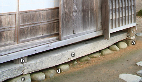 a) *soseki 礎石 b) *hashira 柱 c) *dodai 土台 d) hazama-ishi 狭間石