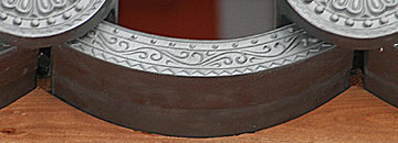 An asymmetric arabesque pattern. Most arabesque patterns have a centrally positioned motif *chūshin kazari 中心飾 from which flow rhythmical arabesques that are exactly the same but run in opposite directions *kinsei karakusamon 均正唐草文. The henkō type pattern, however, runs continuously from one end of the broad to the other. One example, on a tile unearthed at Fujiwarakyū 藤原宮 (694-710), has a predominant curvilinear core from which, and around which spring dynamic lines ending in simple curlicues. Some scholars suggest that the curlicues, especially those passing the center of the tile, might represent a cloud motif. Some of these continuous patterns have no end borders wakitai 脇帯. Others have clearly defined end borders filled with a continuous linear zigzag motif *kyoshimon 鋸歯文 created along the lower border *shimotai 下帯. The upper border uetai 上帯 is filled with a bead pattern *shumon 珠文. Some henkō patterns resemble the so-called honeysuckle motif and are called henkō nindō karakusamon 扁行忍冬唐草文.