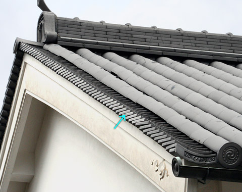 Also sekigai sodegawara 積蓋袖瓦. A broad, rectangular type of concave roof tile *hiragawara 平瓦. It is laid from the eave-ends *nokisaki 軒先, to the ridge *munagi 棟木, over the gable bargeboards *hafu 破風, to make a neat finish for the barge course *keraba 螻羽, usually on gable roofs *kirizuma yane 切妻屋根. Because all of these tiles are of the same shape, they can be used on both sides of the bargeboards. This method is employed especially on small temples or shrine gates and on some folk dwellings *minka 民家, and storehouses *dozō 土蔵. A tile with a pendant *gatō 瓦当, attached is used at the corner ends. This is called *hirasode kakugawara 平袖角瓦 (broad-sleeve angular tiles). These pendant tiles are used at the edge of the eave to complete the row of concave tiles and create a neat finish over the bargeboard of a small gable roof. Example: the recently erected rear gate, Uramon 裏門 at Nyoirinji 如意輪寺, in Nara.