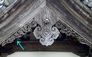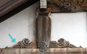 Lit. fins. A decorative sculpted form found, for example, on the left and right of a gable pendant *gegyo 懸魚, along a bargeboard, and on both sides of a goblin mask tile *onigawara 鬼瓦 or a bottle-shaped post *taiheizuka 大瓶束. Hire flanking a taiheizuka are known as *taiheibire 大瓶鰭, *gasshōhire 合掌鰭.