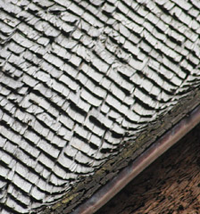 A roof covered with layers of Japanese cypress hinoki 桧 (檜) bark shingles. The shingles are usually 45-60 cm in length, 4-15 cm in width, and 9-12 cm thick. The extension from the overlap of one shingle over another is 1-2 cm. Cypress shingles are secured with bamboo nails.