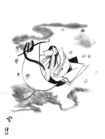 A pictorial subject taken from "Fireflies" Hotaru, Chapter 25 of Genji monogatari 源氏物語 (The Tale of Genji). While *Tamakazura 玉鬘 is meeting with her suitor, Prince Hotaru, Hyōbukyō no Miya 兵部卿宮, on an evening in the fifth month, Genji releases a bagful of fireflies into the room to provide a glimpse of her face by their light, a motif derived from Episode 39 of Ise monogatari 伊勢物語 (The Tales of Ise). This chapter is also famous for the discussion between Genji and Tamakazura on the nature of fiction, monogatariron 物語論.