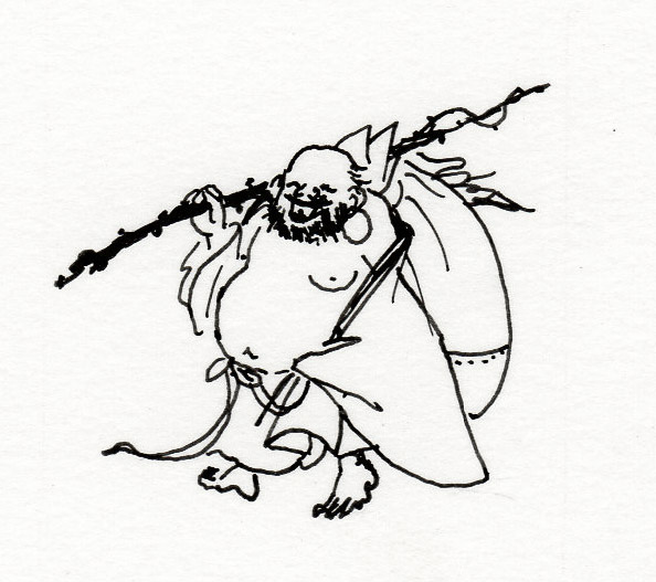Ch: Budai. A semi-legendary, itinerant 10th-century Buddhist monk who became a popular subject in Chinese and Japanese ink painting. His real name is said to have been Qici (Jp: Keishi 契此), whose biography is found in the 908 Song Gaosenzhuan (Jp: Sō Kōsōden 宋高僧伝) or the Legends of High Priests of the Song Dynasty. He lived on Mt. Siming 四明 in Mingzhou 明州, Fenghua 奉化, where he frequently strolled through a nearby town carrying his large cloth bag (Ch: budai; Jp: hotei 布袋). Thus he earned his affectionate nickname, Priest Budai. Budai's air of "enlightened innocence" led him, like *Kanzan Jittoku 寒山・拾得, to be admired as an exemplar of Zen values. Although originally he was said to have filled his bag with anything he encountered on his wanderings, later Zen interpretations speak of Budai's empty bag. Ironically, in Japanese popular culture Budai's bulging bag and contented appearance led to his inclusion in the seven gods of good fortune *shichifukujin 七福神. Budai was also thought to have been an incarnation of *Miroku 弥勒.