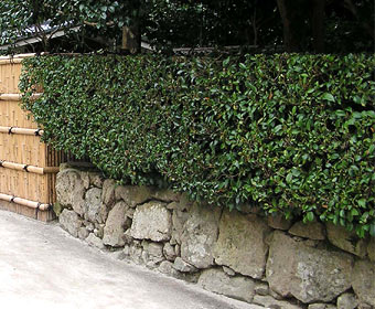 A large clipped hedge or ōkarikomi 大刈込 may be used to block out unwanted views, *dankei 断景. Ikegaki around houses often serve as windbreaks, while their use between different people's land serves as a property marker. Because of the ancient belief that a god kami 神 resided in evergreen plants himorogi 神籬, ikegaki were often used in shrines and temples to divide space. Evergreens such as Japanese cypress hinoki 桧, Chinese black pine maki 槇 and sakaki 榊 are most frequently employed, although deciduous trees may be used. For protective hedges, thorn bushes are effective, while the dense leaves of Japanese azaleas, satsuki さつき and tsutsuji 躑躅, make them effective when used to block unwanted views.