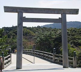 Gateways *torii 鳥居, specific to Ise Jingū 伊勢神宮, of which there are two types. Both are called ise torii and both are related to *shinmei torii 神明鳥居 but have certain characteristics which set them apart. The ise torii are to be found in the two sanctuaries, Naikū 内宮 (the Inner Shrine) and Gekū 外宮 (the Outer Shrine). With the exception of the four torii attached to the four outermost concentric fences which surround the inner sanctuaries of the Naikū and Gekū, all the other torii are of the same style. The torii at either end of the Uji 宇治 Bridge at the Naikū exemplify the style closest to the shinmei torii. However, the circular pillars have a noticeable inward incline *uchikorobi 内転. The rectangular tie beam *nuki 貫 is secured by wedges *kusabi 楔, inserted on the inner faces of the pillars. As with the shinmei torii tie beams, the Uji Bridge tie beams do not extend beyond the outer faces of the pillars. The top lintel *kasagi 笠木 is a heavy beam, but unlike the shinmei torii top lintel, all the ise torii are pentagonal in section. The upper surface of each end of the torii has a very slight and almost in perceptible thickening at the ends giving the impression of a curve and an inward slanting cut on each end *tasukizumi 襷墨. Torii of this type also include the First and Second Torii, Ichi no torii 一の鳥居, Ni no torii 二の鳥居, at both Naikū and Gekū, and the middle torii, called Nakanoe no torii 中重鳥居. This is the pillar between the second and third fences within the sacred precinct at both the Naikū and Gekū. None of these three torii existed before the 14th century. The second type of ise torii can be seen on the south side of the outermost fence, itagaki 板垣, which is itself attached to the exterior of each circular pillar. The pillars have a slight inward incline. The tie beam, secured by wedges, is exactly the same as the above described torii. However, these pillars have both secondary and top lintels *shimaki 島木 and kasagi. The secondary lintel is a flat, broad, straight, heavy, rectangular beam, that is greater in width than the diameter of the pillars. The rectangular top lintel is set up on its narrow face and extends beyond the end of the secondary lintel. The undersides are straight, but there is an almost imperceptible thickening from bottom to top on each end of the top lintel which creates the same very slight upward curve seen on all ise torii. The top lintel is pentagonal in section. All the torii are made of wood and are replaced every twenty years, as are all the buildings of the inner precincts of both the Naikū and Gekū, as well as several other buildings not within the most sacred areas.
