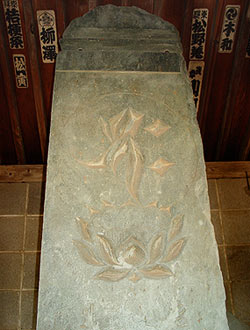 One type of pagoda or stupa, tōba 塔婆, in the form of a flat stone stele that became prevalent in the early 13th century and was widely used until the early 17th century, when it disappeared altogether. Two grooves are cut between the body of the stupa and the pyramidal form at the top. The earliest examples were 40-60 cm wide, tapering somewhat toward the top of the face just below the grooved section. Later, they were much narrower, about 20 cm or less. Some itabi were believed to be as high as 5 m, but it is more likely that most were about 2 m. Their origin is obscure and no clear reason for their abrupt cessation is known. They were erected as memorials and as a visible means to draw those who strayed from the "true path" of Buddhism back into the fold. Sanskrit, or Buddhist images were carved into the upper part of the body, while Buddhist texts, names and dates were cut in the lower part. Some inscriptions seem to convey prayers. The names *Amida 阿弥陀 who ruled over the Western Paradise, *Shaka 釈迦, or *Dainichi 大日 of Esoteric Buddhism mikkyō 密教 appear many times. A preponderance of itabi exists in the Kantō 関東 region, and many are made of a green or greenish-blue stone from Chichibu 秩父 in Saitama Prefecture. Examples: Ōnuma Kōen 大沼公園 (1227) ; Kannonji 観音寺 (1233), both in Saitama Prefecture; Shōfukuji 正福寺 (1248) in Tokyo.