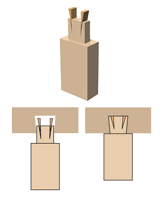 Lit. hell tenon. So named because once it is inserted, it is impossible to withdraw. A blind tenon joint with wedges *kusabi 楔 inserted tightly into slots made on its end. It is important first to place the wedges loosely into the slots to inhibit premature horizontal spreading of the tenon. The base of the tenon is large enough to fit the dovetail-like, tapered shape of the mortise *hozoana ほぞ穴. When the tenon with wedges is pounded into the mortise, the wedges cause the tenon to expand to fit the sides of the mortise. Only the wedges extend the depth of the mortise. The tenon itself does not. Wedges may also be placed on each side of the tenon. The jigokuhozo joint is used where it is necessary that it be hidden, for example on bracket complexes under the eaves of a building, in furniture and cabinet making, and especially in joinery used in the shoin style *shoin-zukuri 書院造.
