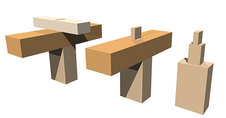 Also called kasanehozo 重ねほぞ; also ryōhozo 両ほぞ. Lit. a stacked tenon. A tenon with a 2-stepped broad base ōnehozo 大根ほぞ and a relatively slender, long, extended piece, cut from the original block of wood. The small vertical extension is called a haunch tenon *konehozo 小根ほぞ. When this tenon is inserted into a mortise, it is referred to as rabbeted. It is used to join the tops of the pillars to transverse beams and purlins. The name ryōhozo is derived from the two steps extending on opposites sides of the haunch.