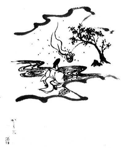A pictorial subject based on the "Flares" Kagaribi, Chapter 27 of Genji monogatari 源氏物語 (The Tale of Genji). Illustrations chosen for this chapter include: Genji giving lessons on the koto 琴 (Japanese zither) to *Tamakazura 玉鬘 on a summer evening lit by a flare underneath a spindle tree that arches over a brook in the garden below; or slightly later in the same place with *Yūgiri 夕霧, *Kashiwagi 柏木, and his brother who have joined them for a concert.