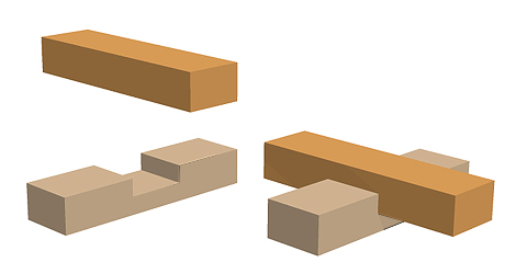 Also pronounced kakikomu; watarikakitsugi 渡欠継. Also written kakikomu 缺込む in old sources. One of the joints belonging to a group of crossed, right angle joints called jūjikei 十字形. It is used to secure two members at right angle. Only one member has a part cut out about half its thickness, and wide enough to receive an uncut timber at right angles to it.