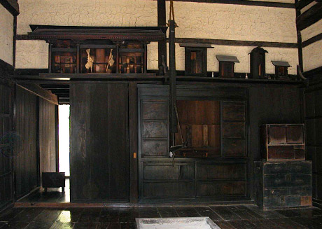 An interior shelf *tana 棚, where paper talismans, kamifuda 神札, or amulets, gofu 御符, issued by the major Shinto shrines were enshrined for worship as tutelary household deities *kami 神, in traditional vernacular houses *minka 民家 of the Edo period. Candles were lit and offerings of rice, fruit, fish, rice wine, etc. were made daily. Little is known about the early development of the kamidana, but small shrines to tutelary deities inside a residence go back to ancient times among the aristocracy, as the Heian period Higashi Sanjō 東三条 mansion demonstrates. It is probable that in early times offering tables within a house were not permanent, but were set up as occasion demanded for specific ceremonies and afterwards removed. Dating the emergence of the kamidana is difficult because there are few old examples, but it was closely connected with the development of the domestic Buddhist altars *butsudan 仏壇. One of the earliest surviving examples may be found at Yoshimura 吉村 House, a 17th-century village headman's residence near Osaka, now an Important Cultural Property. This consists of a recess equipped with shelves and sliding doors *fusuma 襖, but it is not clear whether this originally functioned as a kamidana. A more common type of kamidana occupied the top part of a cupboard unit todana 戸棚, and resembles a doored upper shelf *fukurodana 袋棚. However, the most widespread type was a plain board forming a shelf fixed to the top of the lintel members *kamoi 鴨居, and supported by cantilevered brackets from beneath, or stabilized with timber hangers *tsurigi 釣木, suspended from the beams above. On this shelf a miniature Shinto shrine was often installed to contain the kamifuda. This structure may be elaborate in design, though unlike the miniature shrine cabinet *zushi 厨子, of the Buddhist altar, the timber was usually unlacquered *shiraki 白木, following one of the most venerable traditions of shrine architecture. This type of kamidana was believed to have developed comparatively late and the decorative shrine later still. The kamifuda enshrined may be that of a clan deity, ujigami 氏神, or come from one of the major national shrines, such as Ise Jingū 伊勢神宮. Particularly in the houses of craftsmen and merchants, there may be separate shelves known as engidana 縁起棚, where deities with combined Shinto and Buddhist identities, such as *Ebisu 恵比須, *Kōjin 荒神 or Inari 稲荷 were commonly enshrined. It was not unusual for houses to have two separate kamidana. Kamidana were most often located in one of the main everyday living rooms or the kitchen, close to the earth-floored area *doma 土間. They were sometimes placed toward the rear of the room, facing the front of the house *omote 表, or at the high end *kamite 上手, facing down the room toward the doma. They were often placed in the corner of a room for better support. In many 17th century to early 18th century farmhouses in central and eastern Japan, the kamidana, though usually a later addition, was placed close to the shallow decorative alcove *oshi ita 押板, in the living room *hiroma 広間. In rare cases, for instance, if the house was totally Shinto and had no butsudan, the kamidana was installed in one of the formal reception rooms *zashiki 座敷.