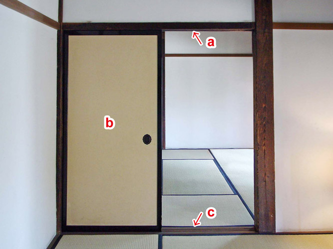 A generic term for a head jamb. Unlike the lintel *magusa まぐさ, kamoi normally have tracks for sliding doors or partitions. Also called uchikamoi 内鴨居. Older head jambs are thicker than later ones. The length equals the inside measurement of the width of an opening for installing either a single sliding door *hikido 引戸 or double sliding doors *hikichigai 引違. There are several types: