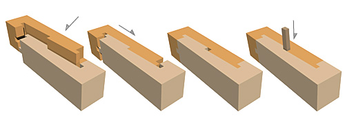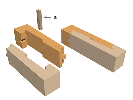 An oblique, housed (dadoed), rabbeted, T-shaped, half-blind, tenoned scarf joint. Because both the tenon and mortise are blind, the joint cannot be slipped together from the side, as in an oblique, housed, rabbeted, scarf joint *okkake daisentsugi 追掛大栓継. The oblique surface on the mortised half of the indented part is decreased by the depth of the rabbet. Therefore, the end with the inverted T-tenon on the corresponding piece must be inserted in a lengthwise direction. Then a joining draw pin komisen 込栓 (see *sen 栓) is driven through the opening provided in the center to lock the joints. Sometimes two keys *shachi 車知 are used in place of a draw pin to strengthen the joint. This joint is commonly used in foundation footings *dodai 土台, wall plates *daiwa 台輪, the beam used for the bottom tracks for sliding doors or window *shikigeta 敷桁, and in eave purlins *dashigeta 出桁. The improvement in carpenter's tools in the Edo period made it possible to fashion complex joints such as this.