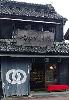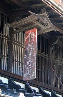 A signboard placed outside or affixed to the front of a commercial premises displaying the name of the shop yagō 屋号, and the nature of the business. Special variants in the case of theaters gekijō 劇場, might display the plays currently being performed. Kanban appear to have developed in Japan during the Edo period, for there are none in the late Muromachi illustrations of urban scenes (such as the *rakuchū rakugai zu 洛中洛外図). Instead curtains *noren 暖簾, in shop entrances were used to identify merchants' houses *machiya 町家 at that time. Sometimes the sign was applied directly to an architectural element, such as a projecting gable parapet *udatsu 卯立 or the box holding the rain doors *tobukuro 戸袋, but the simplest Edo period, kanban were wooden boards with characters painted or incised on them, which were suspended from the eaves of either the main roof or the front roof *hisashi 廂, parallel or at right angle to the facade, or mounted on the hisashi roof. Sometimes the board was given a decorative outline, related to the nature of the business: a pot for a vinegar manufacturer, or a comb for a comb-maker. In the latter half of the Edo period, more elaborate kanban developed, taking the form of small roofed structures yakata 屋形, and using elements of architecture usually associated with temples or shrines, such as bracket systems *tokyō 斗きょう and cusped gables *karahafu 唐破風. These reflect the increasing prosperity of the merchant class. A more abstract form of kanban were the balls of cedar needles sugidama 杉玉, suspended from the eaves of sake 酒 breweries sakaya 酒屋.