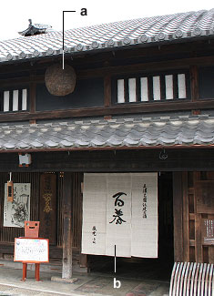 a) sugidama 杉玉 b) *noren 暖簾