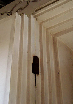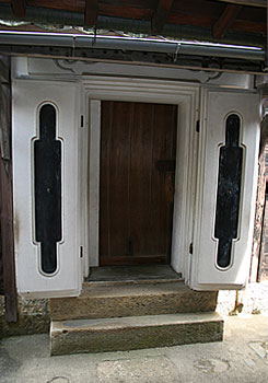 2 The heavy fireproof swing doors used in fireproof storehouses *dozō 土蔵. The doors had a timber framework to which first mud walls *tsuchikabe 土壁, and then white or black plaster coat *shikkui 漆喰, were applied as in fireproof storehouse construction *dozō-zukuri 土蔵造 (see *tsuchido 土戸). The finished door within its fireproof plaster coat was about 18 cm thick. The peripheral doorframe, likewise cased in plaster, had a timber skeleton which resembled a lintel gate *kabukimon 冠木門, with uprights kabukibashira 冠木柱 and a lintel projecting at both ends *kabuki 冠木. It stood in front of the main frame of the building, to which it was fastened back by long iron straps attached to the hinges. The most striking feature of the doors was the stepped profile *jabara 蛇腹 of their flanged reveals, which were designed to interlock precisely both with an identical profile on the frame and with the opposing door, reducing the possibility of flames spreading to the interior of the storehouse through gaps around the doors (for even greater security, these gaps were sealed with mud). The resemblance of the stepped profile of the reveals to the double folded door leaves of the original kannonbiraki tobira (See 1), when the doors stand open, probably accounts for the use of the term in this case.