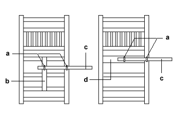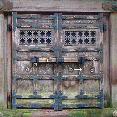 a) kannukikasugai 閂鎹 b) kannukizuri tatezan 閂摺竪桟 c) kannuki 閂 d) kannukimochizan 閂持桟